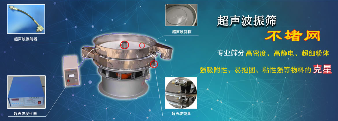超聲波振動(dòng)篩由超聲波諧振電源、振蕩器、外網(wǎng)環(huán)和共振環(huán)組成。篩網(wǎng)上的物料在做低頻三次元振動(dòng)的同時(shí),疊加上超聲波振動(dòng),既可防止網(wǎng)孔堵塞,又可提高篩分產(chǎn)量和質(zhì)量。有效的解決因團(tuán)聚、靜電、強(qiáng)吸附性卡堵網(wǎng)孔等難題,是篩分行業(yè)的一項(xiàng)重大技術(shù)突破。