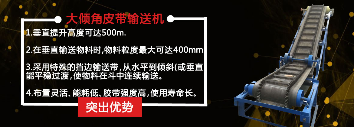 DJ型大傾角皮帶輸送機與普通式輸送機、斗式提升機、刮板輸送機比較其綜合技術(shù)性能都非常優(yōu)越.輸送量大可達6000m3/h垂直提升高度可達500m.在垂直輸送物料時物料粒度較大可達200mm,從水平到傾斜(或垂直)能平穩(wěn)過渡,能耗低、結(jié)構(gòu)簡單、維護方便、皮帶強度高、使用壽命長.
