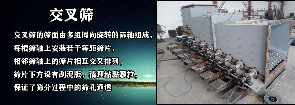 【產(chǎn)品介紹】:交叉篩的篩面由多組同向旋轉(zhuǎn)的篩軸組成,每根篩軸上安裝若干等距篩片,相鄰篩軸上的篩片相互交叉排列,篩片下方設(shè)有刮泥版,清理粘黏顆粒,保證了篩分過(guò)程中的篩孔通透