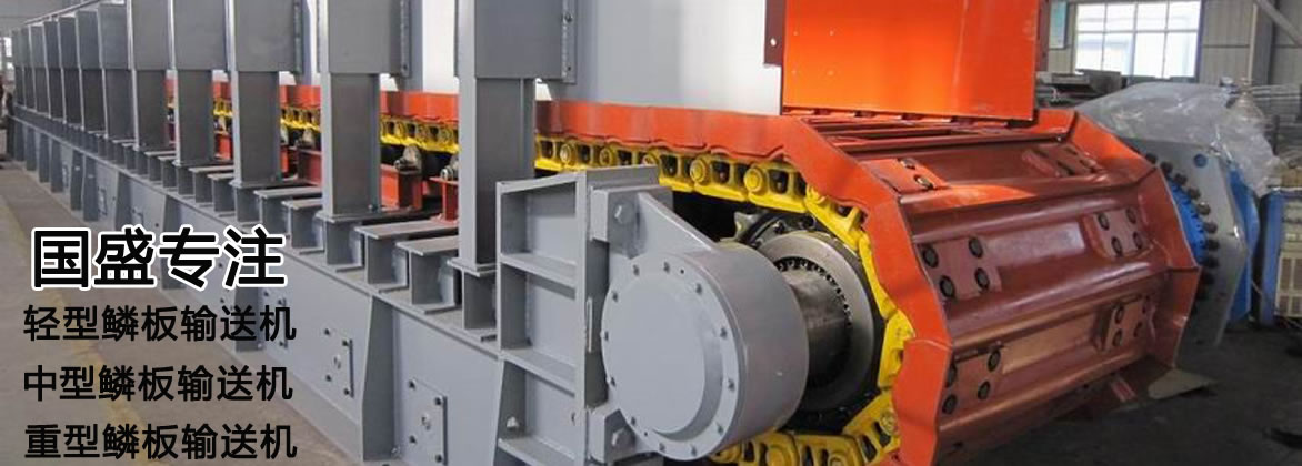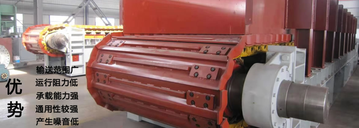 鱗板式輸送機(jī)采用節(jié)距高強(qiáng)度模鍛鏈條為牽引件,兩根鏈條繞過安裝在機(jī)體頭部的一對(duì)驅(qū)動(dòng)鏈輪和機(jī)體尾部的一對(duì)張緊輪聯(lián)成封閉形回路,在兩排鏈條的每個(gè)鏈節(jié)上裝配了相互交迭的、重型結(jié)構(gòu)的輸送槽而成為一個(gè)連續(xù)的能夠運(yùn)載物料的輸送線路。其自重和物料的重量由安裝在機(jī)體上的多排支重輪、鏈托輪和滑道梁支承。傳動(dòng)系統(tǒng)經(jīng)交流變頻調(diào)速電動(dòng)機(jī)聯(lián)接減速機(jī),再由漲套與驅(qū)動(dòng)裝置直聯(lián)驅(qū)動(dòng)運(yùn)載機(jī)構(gòu)低速運(yùn)行。將尾部料倉(cāng)卸入的物料沿輸送線路運(yùn)至機(jī)體的前方排出,通過鏈條的傳動(dòng)將鱗板上的物料輸送到卸料處,實(shí)現(xiàn)向下方的工作機(jī)械連續(xù)均勻輸送的目的。
