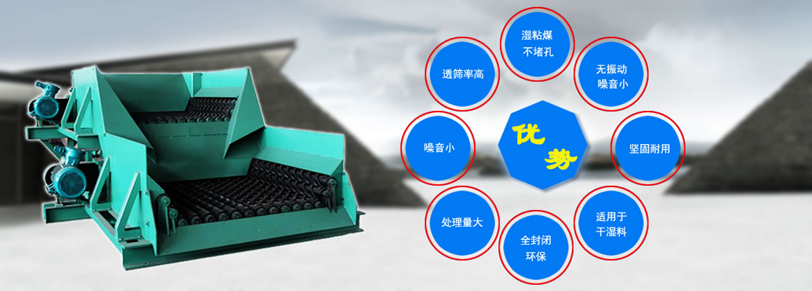 螺旋軸轉(zhuǎn)速較高,物料在篩面上的移動(dòng)速度達(dá)0.5~1米/秒,因此該機(jī)處理能力大。同時(shí)當(dāng)塊狀物料貼著螺桿表面滑動(dòng)時(shí),便能將沾附在其表面的濕粘粉末清洗掉。因此,無(wú)論多大水份的物料,經(jīng)篩分后篩面總是清潔的,不會(huì)產(chǎn)生堵篩孔現(xiàn)象。另外在篩分物料時(shí),物料總是處于螺旋軸徑向不同位置上,當(dāng)螺旋軸旋轉(zhuǎn)時(shí),由于物料的線速度各不相同,從而使物料松散透篩,再加上經(jīng)過(guò)一段篩子篩分后進(jìn)入第后進(jìn)入第二段篩子時(shí)有落差,物料翻落滾動(dòng)得到充分松散,更使其獲得充分的透篩機(jī)會(huì),所以具有很高的篩分效率。這樣的工作原理,同幾十年來(lái)在篩選領(lǐng)域一統(tǒng)天下的振動(dòng)類篩分設(shè)備有著本質(zhì)的區(qū)別。后者靠振動(dòng)篩面使物料拋起,分層透篩,但在遇到濕沾物料時(shí),靠近篩面的粉末較易結(jié)餅夾層,堵塞篩孔,透篩就會(huì)非常困難。特別是8、10、13mm小規(guī)格的篩孔,堵篩更加嚴(yán)重,根本就無(wú)法實(shí)現(xiàn)篩選分級(jí),另外,物料往前滑動(dòng)的動(dòng)力也是產(chǎn)生于篩面傾料后物料自身重力的下滑力,前移就非常被動(dòng)和遲緩,效率低下,這類設(shè)備屬被動(dòng)篩分,而前者是靠螺桿的旋轉(zhuǎn),強(qiáng)制物料推進(jìn),篩孔為動(dòng)態(tài)平移篩孔暢通無(wú)阻,因此具有高效性,屬主動(dòng)篩分。再又由于構(gòu)成篩孔的相鄰兩根螺桿在形成篩孔投影方向的線速度方向是相反的,物料受一對(duì)力偶作用成滾動(dòng)移動(dòng),而不是受擠軋力作用,因此不會(huì)有新的煤塊破碎情況產(chǎn)生。